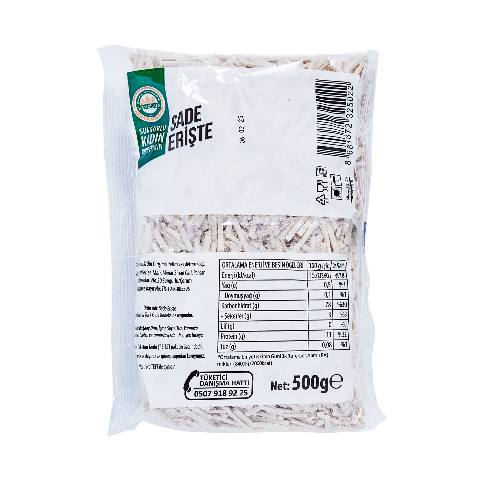 Çorum'un Sungurlu ilçesinde üretim yapmakta olan Sevgisun Kadın Kooperatifi tarafından üretilen erişteler, bol yumurtalı, sert buğday ve kepekli un kullanılarak, doğal kurutma yöntemi ile hazırlanmaktadır. Yediğiniz zaman damaklarda su böreğine yakın bir tat dokusu bırakan tereyağlı erişte ile, kadın elinin değdiği emeği sofralarınızda hissedeceksiniz.